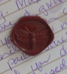 My week is going faster than usual, even, because I’m doing so much editing. Hoping for a much lighter November. I hand-wrote today’s shorty, which is something I haven’t done in a while. I highly recommend going back and forth between hand-writing and composing on the keyboard. There’s something so sensual about running a pen across the page—I think I access my writing brain a little differently. The photo shows today’s inspiration—a little notion that looks like a button (but isn’t) resting on the paper I used to write the story. The notion is embossed with the figure of a… moth… butterfly… dragonfly? I saw a dragonfly at first, so that’s what inspired my story. Now I’m not so sure, but the story, in any case, is a wrap.