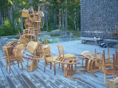 I was at Haystack for a cultural summit that took place over about a 24-hour period. When we summiters woke up the second day and headed to the dining hall, we discovered a treat: Some of our brethren (I think they were all men) stayed up late the night before and with the help of some high-octane inspiration they set to work on… chair sculptures! This is one of the four they made. The protagonist of the day’s shorty handcrafts chairs from reclaimed materials.